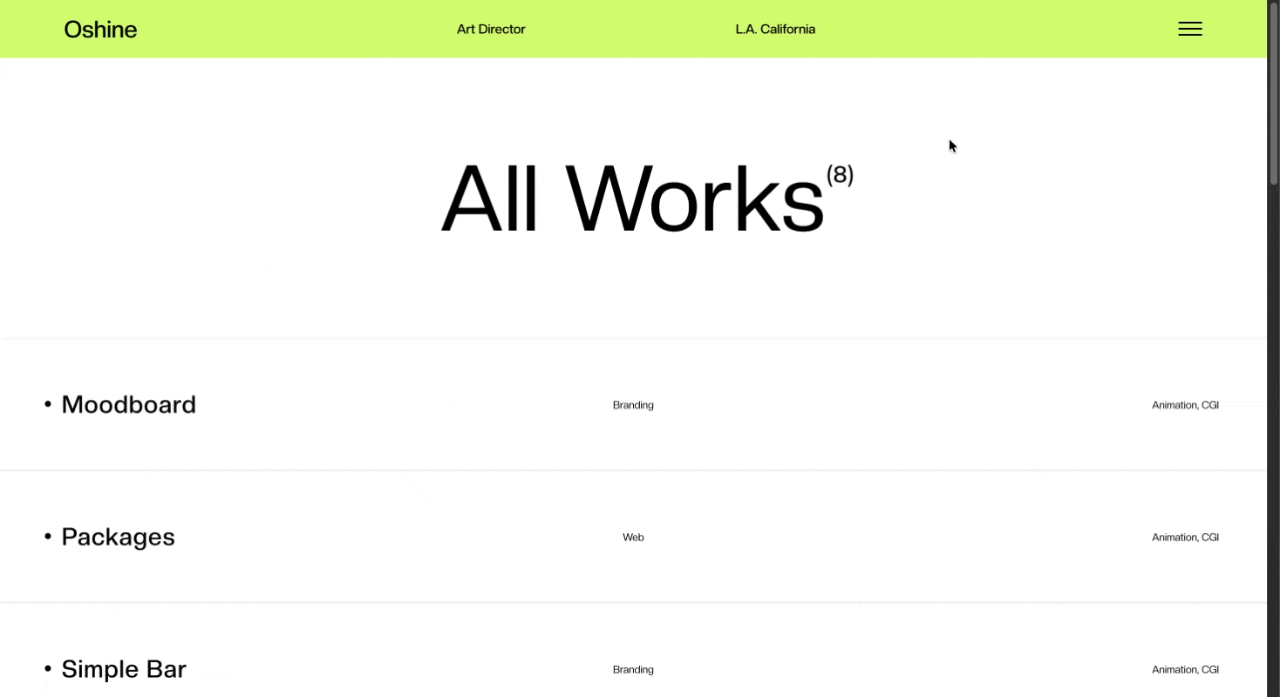 This layout reconsiders how titles, descriptions, and metadata interact with large-format visuals. Text overlays are positioned to complement the imagery rather than obstruct the view. Scrolling feels more deliberate because each project gets its moment before the next one enters view. The format is bold without being aggressive, spacious without feeling empty.
